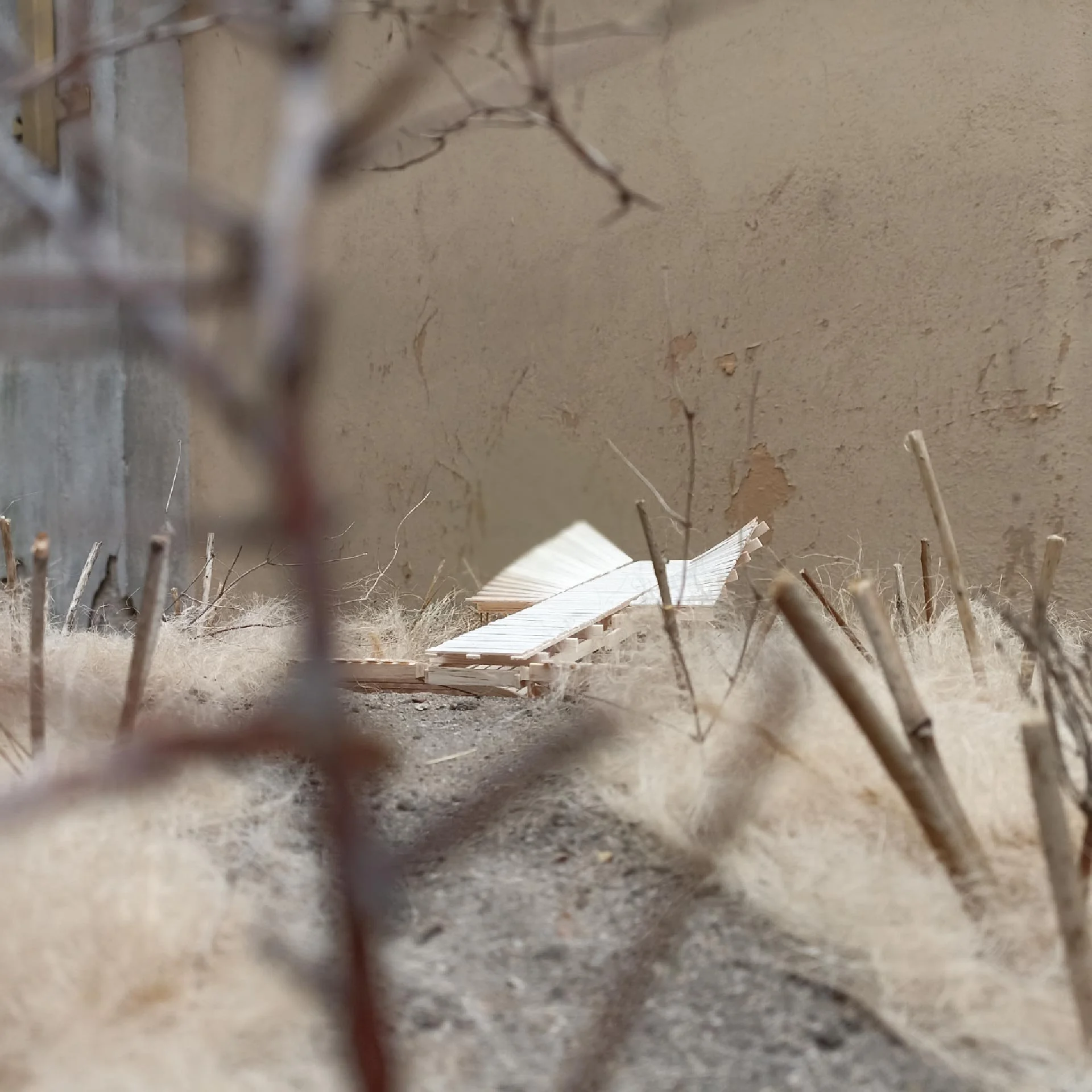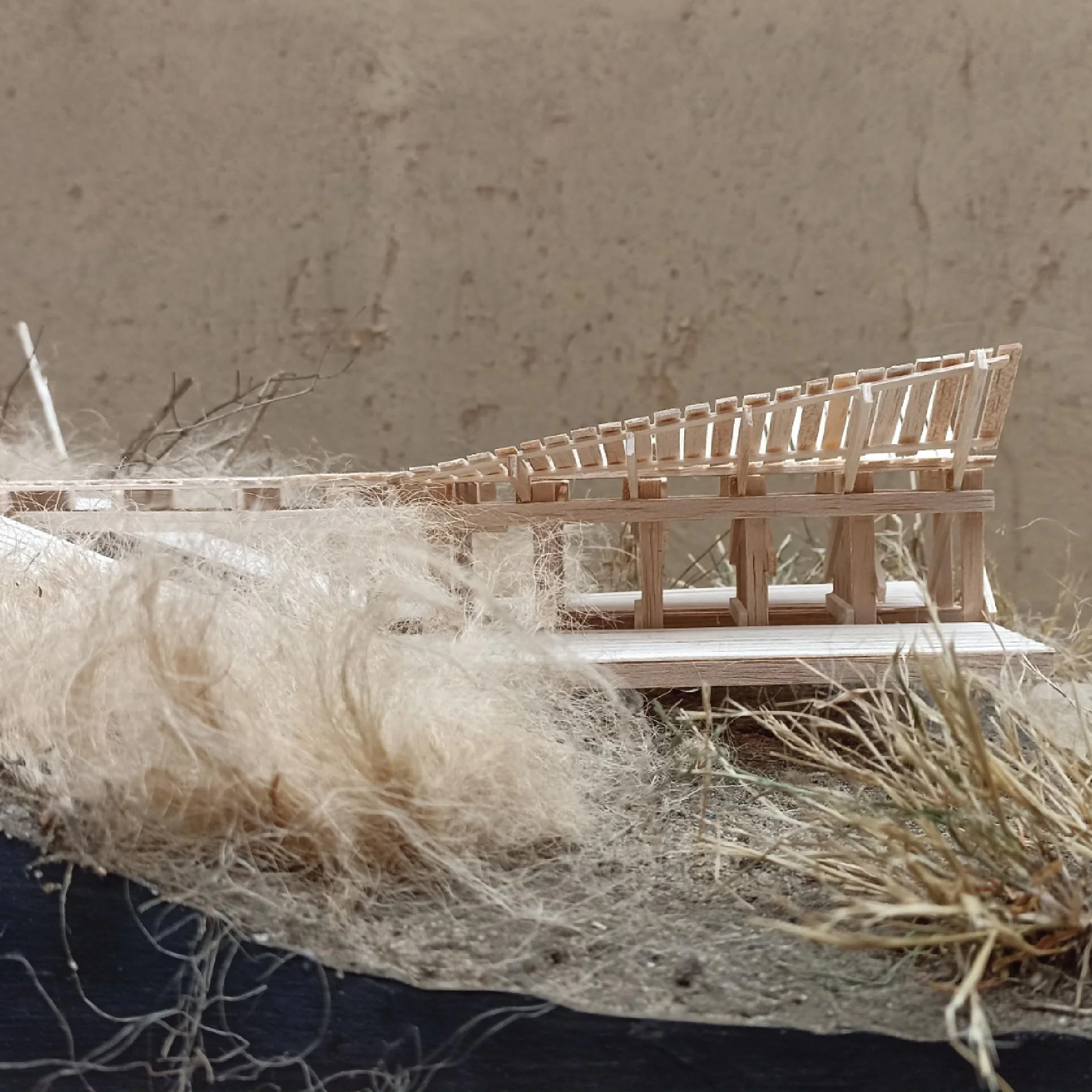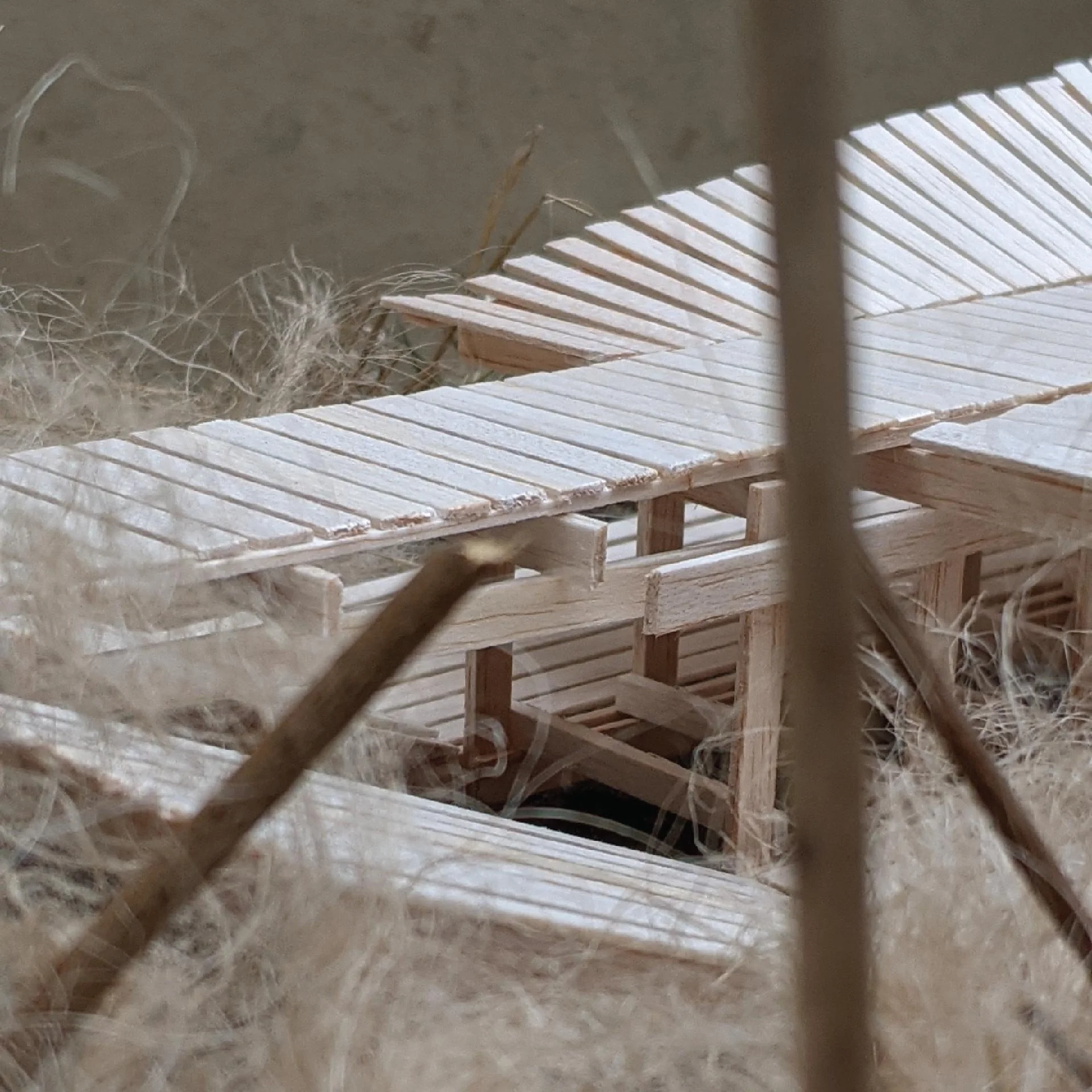 The structure of the bird observatory is placed directly at the shore of the pond, enabling the creation of a two levelled structure. Although the shape might seem like an aesthetical choice, it is directly derived from the multiple functions of the space.