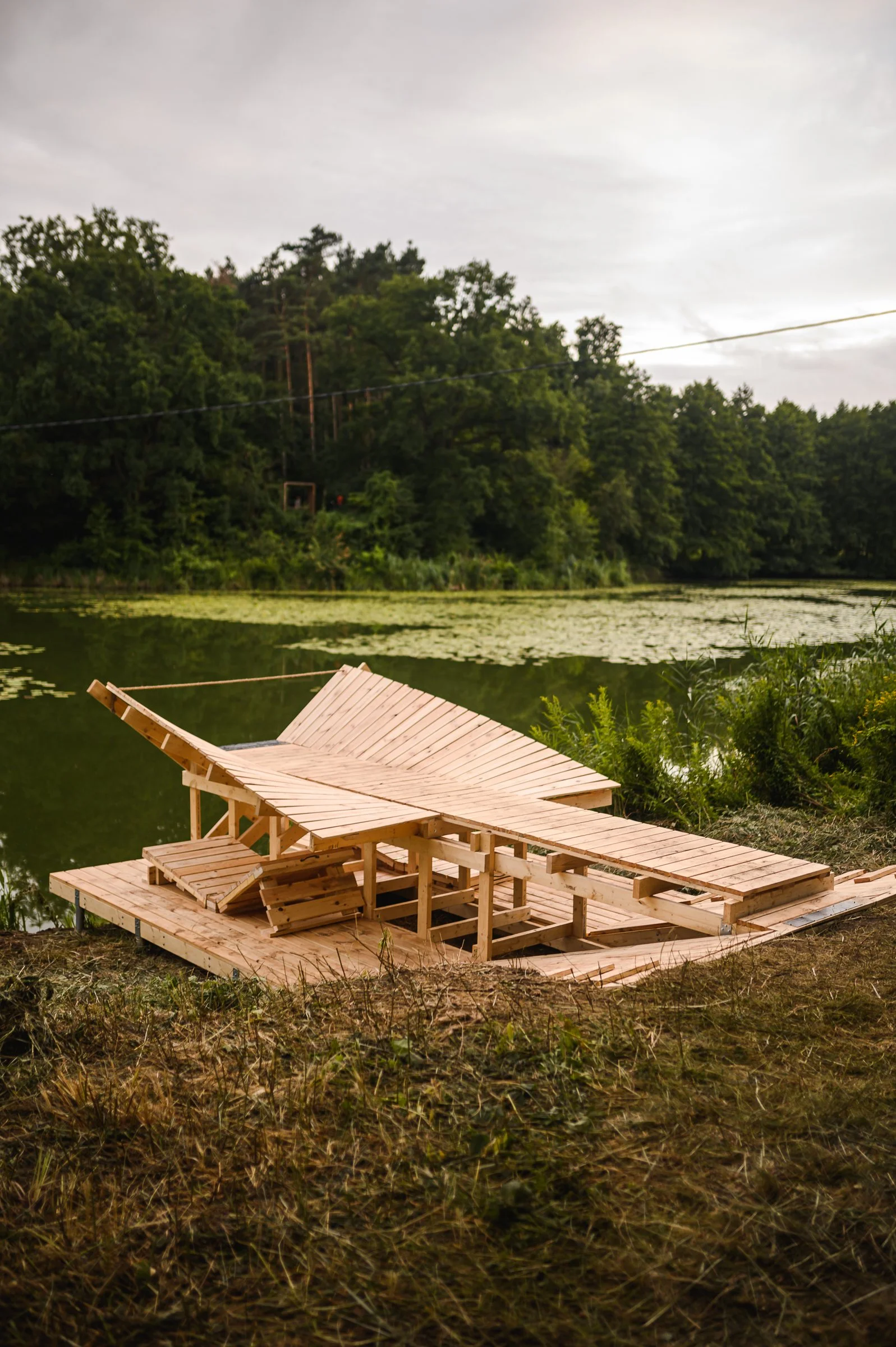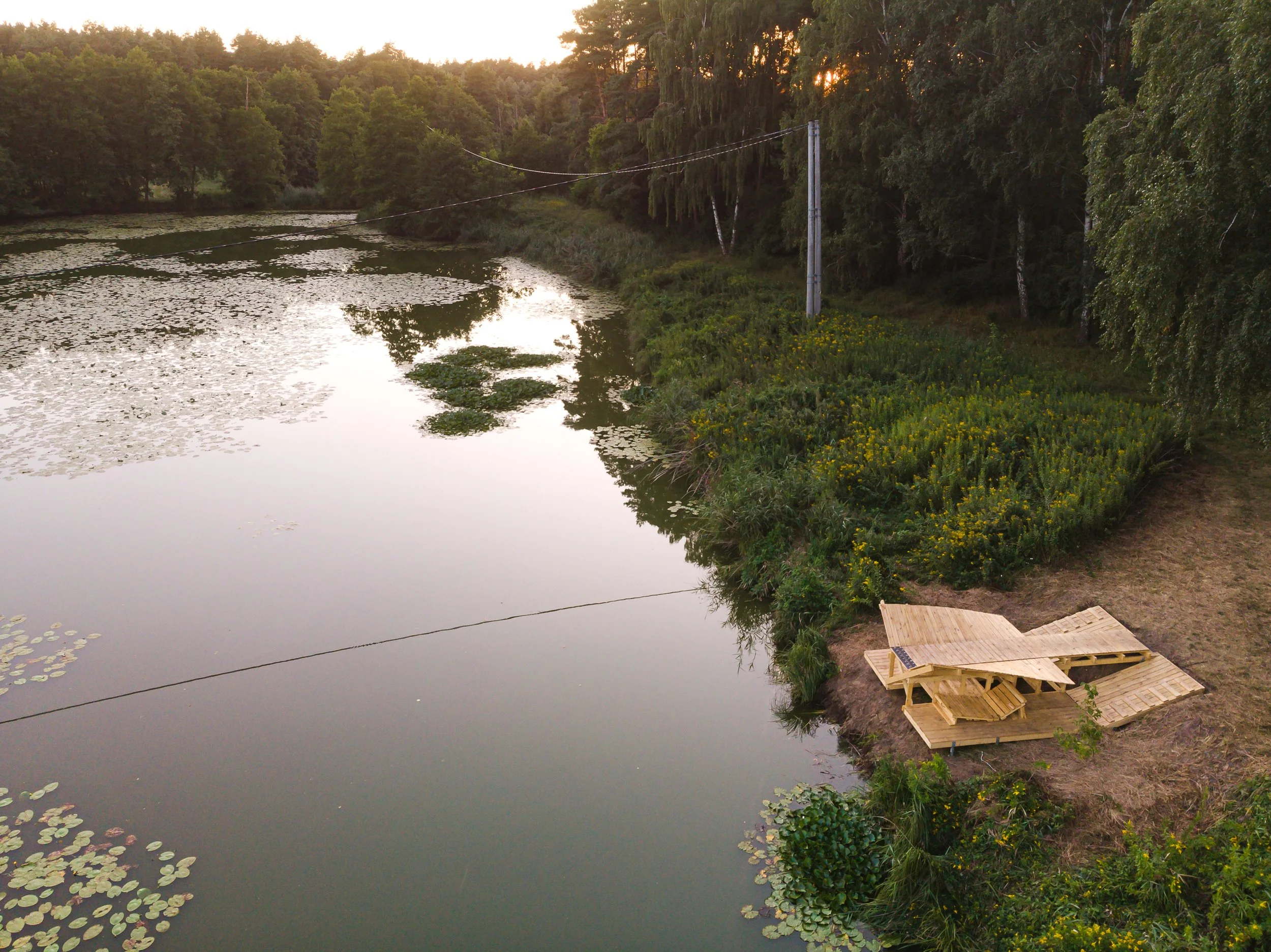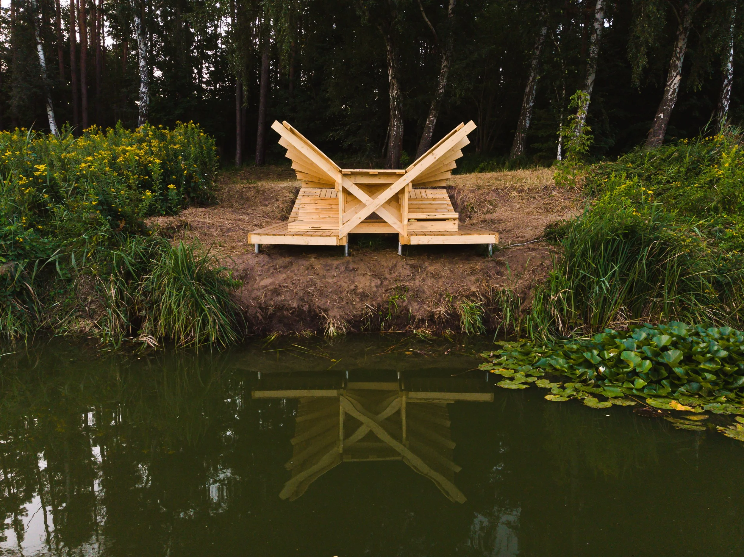 The bird observatory, built during the Mood for Wood workshop, is intended to allow convenient observation of the pond surface and the water area for several people, giving the possibility of intimate contact with nature and shelter from bad weather.
