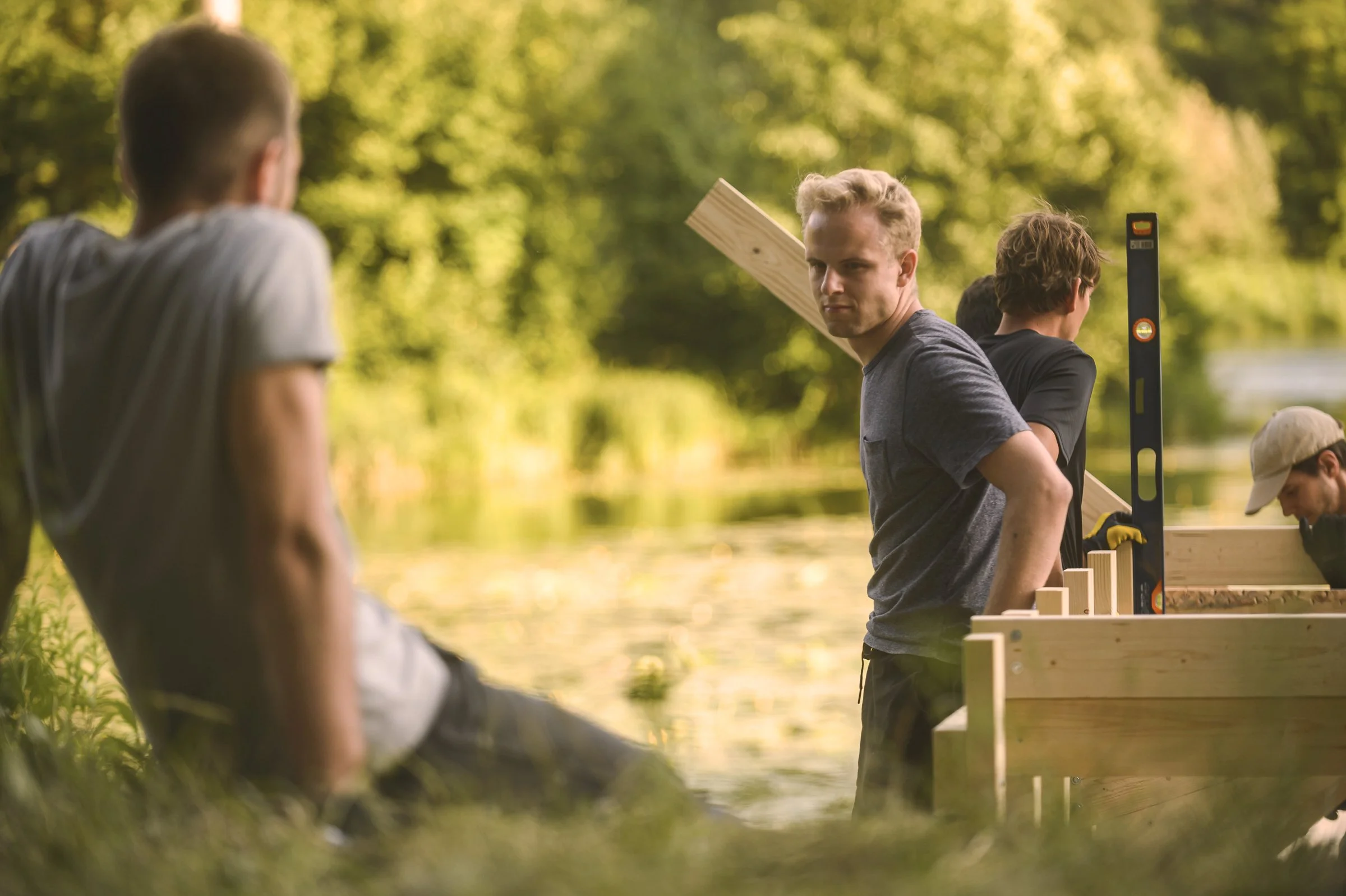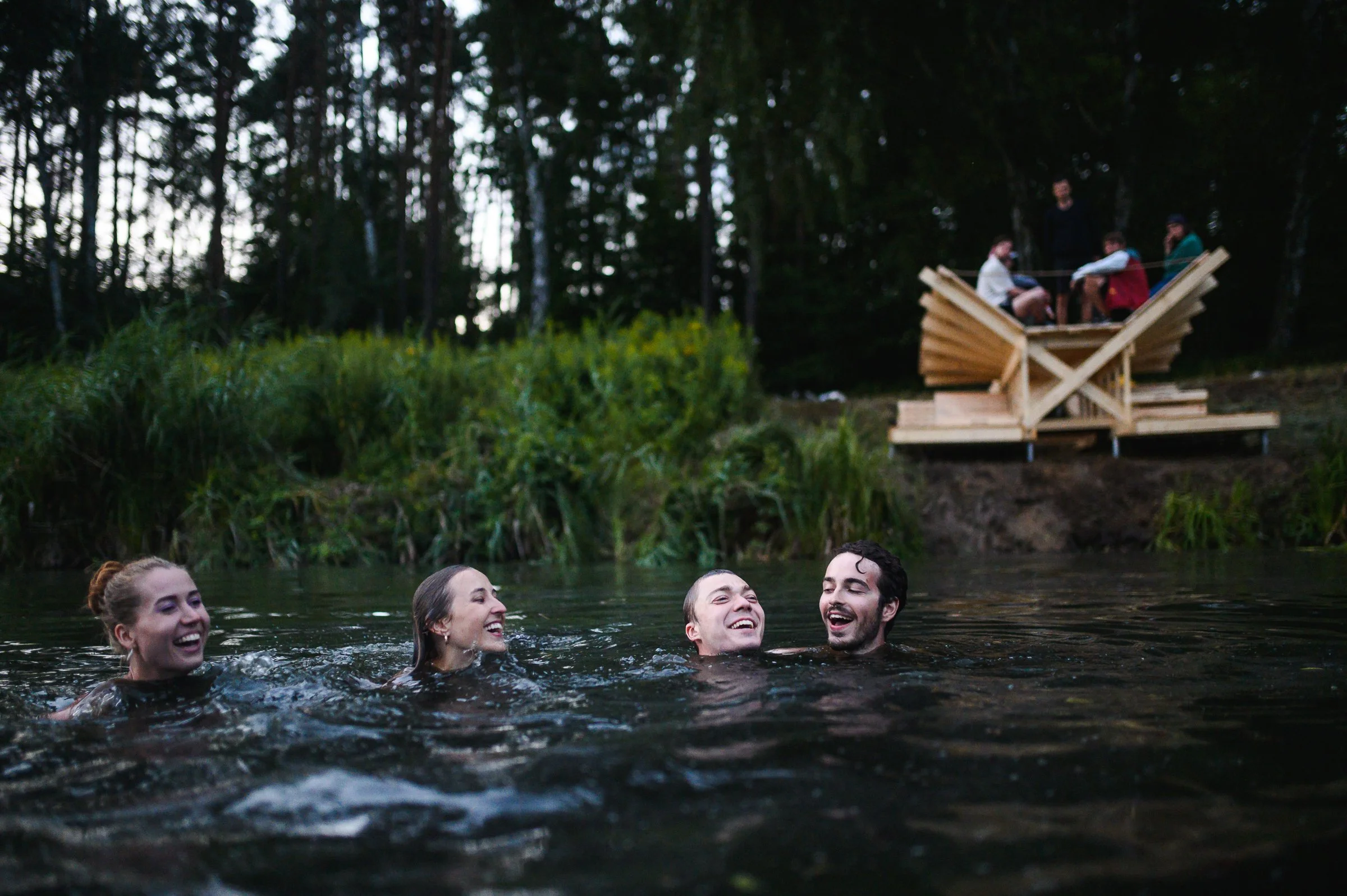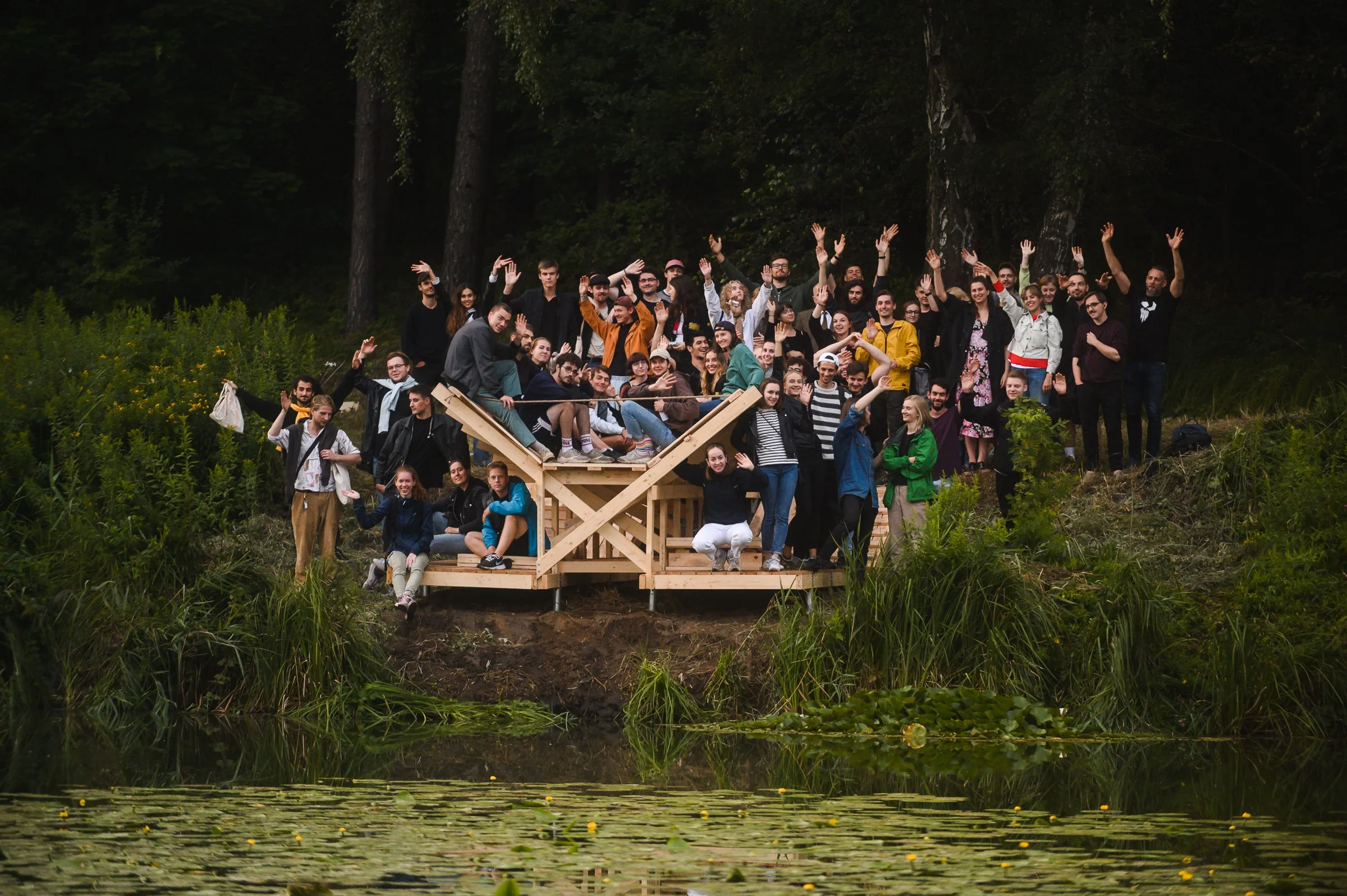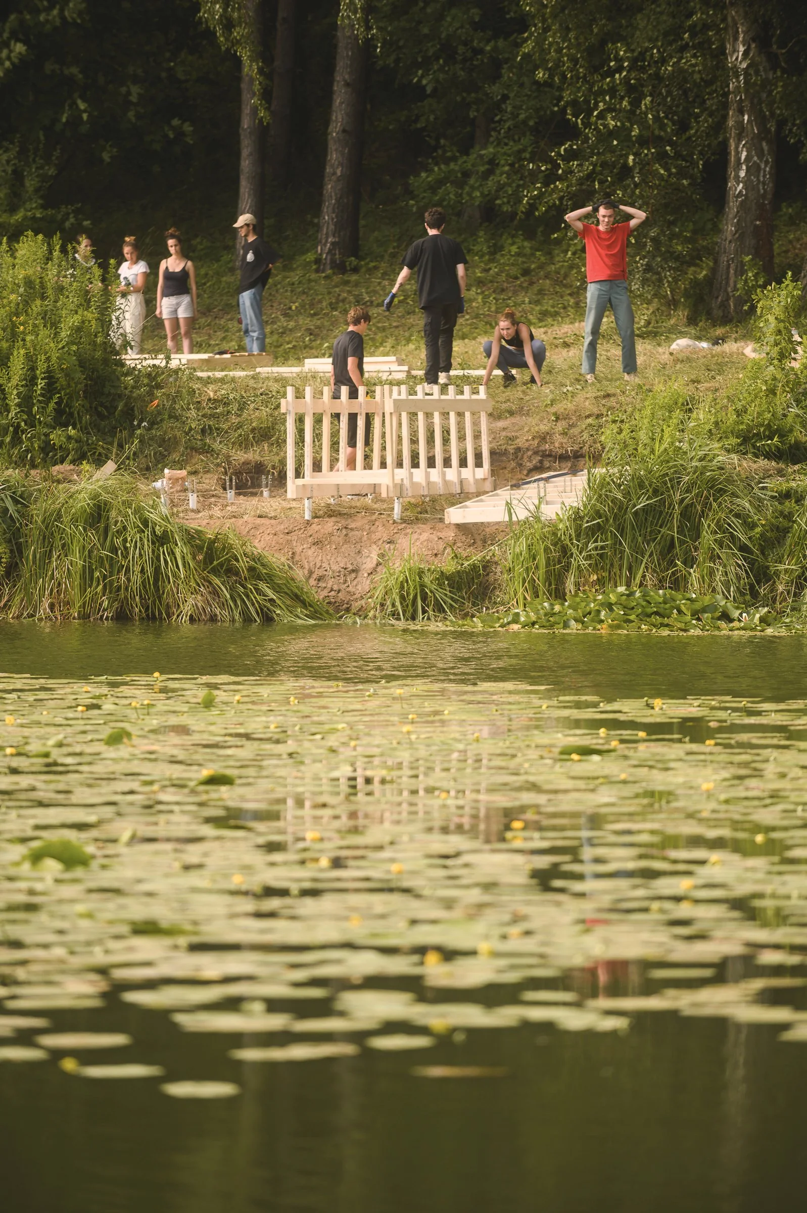 The bird observatory, built during the Mood for Wood workshop, is intended to allow convenient observation of the pond surface and the water area for several people, giving the possibility of intimate contact with nature and shelter from bad weather.