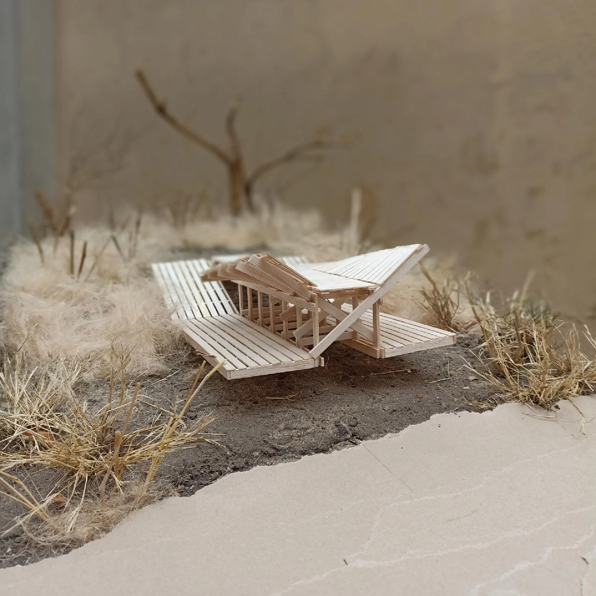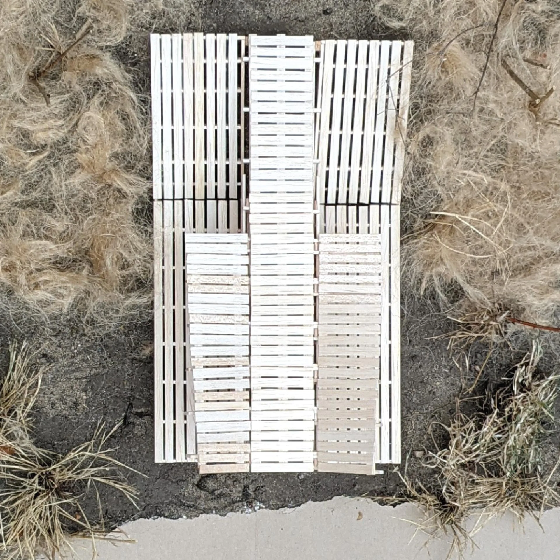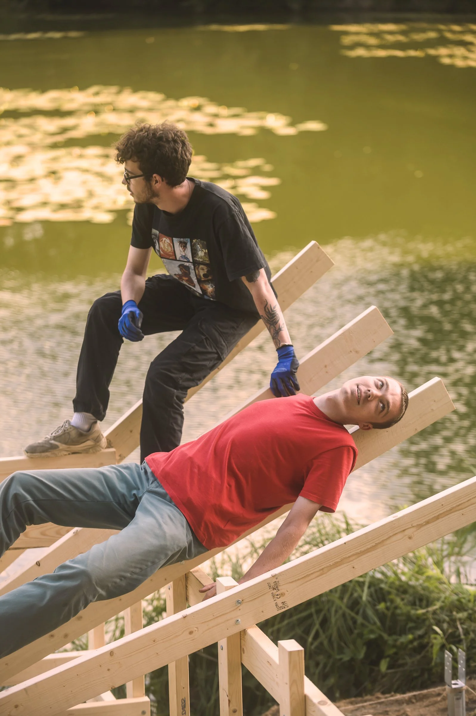 The upper level is shaped similar to a pier, offering a place to stop and take in the beautiful views of the pond, while also giving the opportunity to learn more about the most common birds in Kobylepole – their silhouettes are engraved in the construction and paired with QR codes that lead to more information about them, thus, adding an interactive feature to our structure and engaging in the bird watching not only birders but also regular bypassers. The sides of the upper platform angle gradually upwards, becoming a barrier, shaping the roof of the lower level and, most importantly, providing a comfortable back support while sitting.