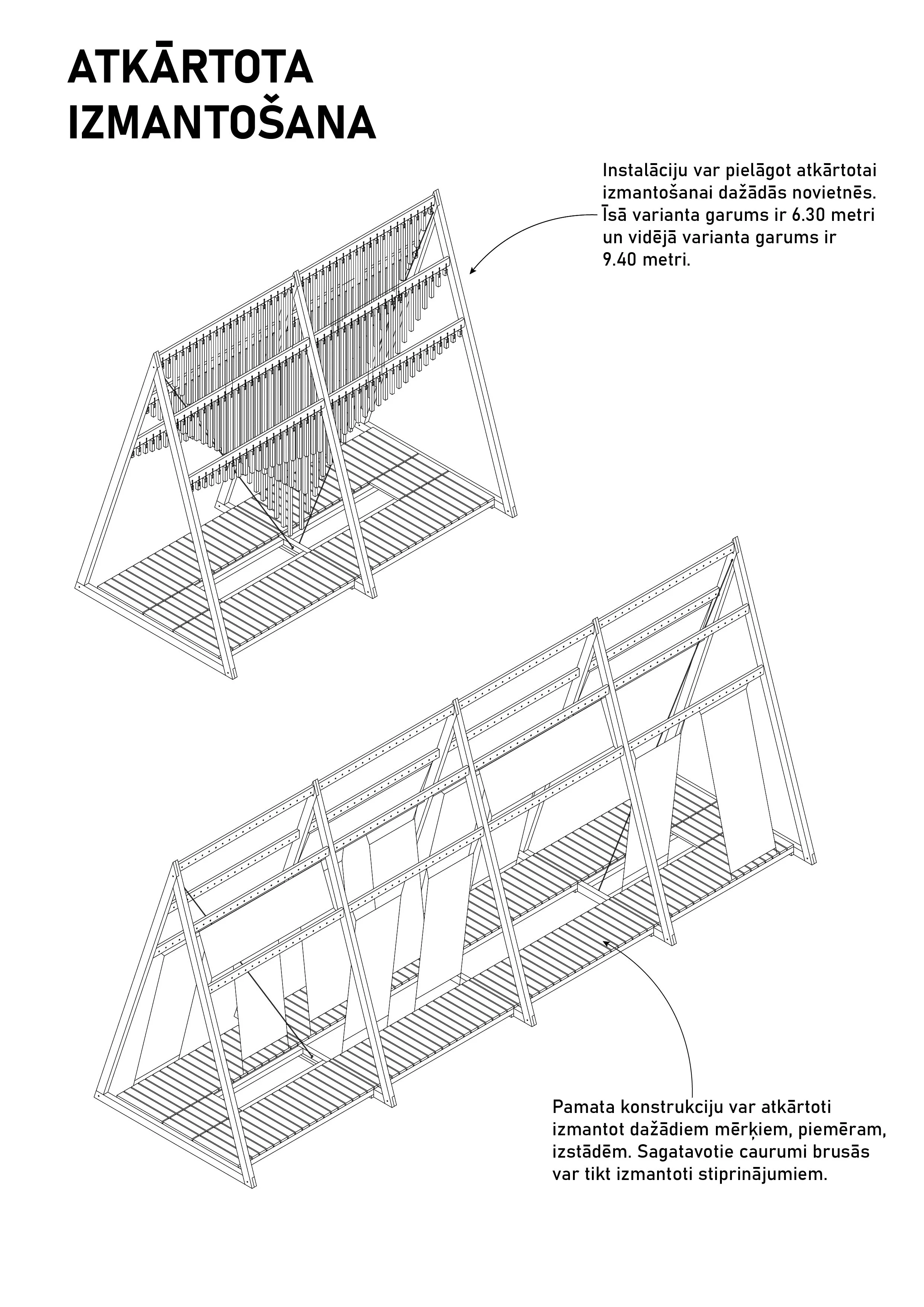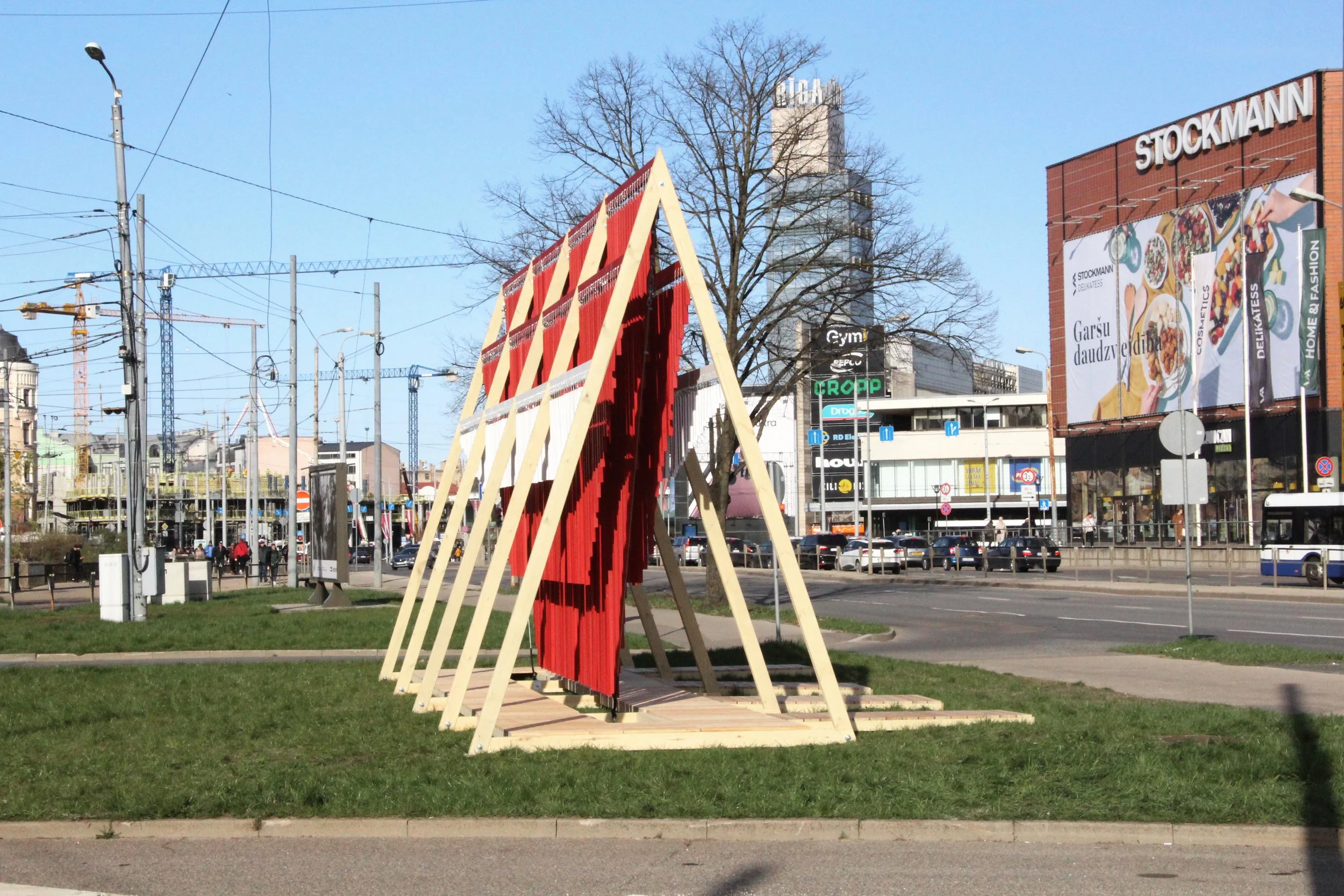 The shape of the modular structure is influenced by Latvian ethnographic signs, where the triangle is the sign of Heaven, symbolically protecting Latvia or its flag. Wooden lats, decorated in the red and white colors of the flag, hung by delicate chains, braid a link with the sounds of folk costume jewelry. Lastly, the 4 footbridges pointing towards the pedestrian sidewalk symbolize May 4th itself, through which one reaches free Latvia.