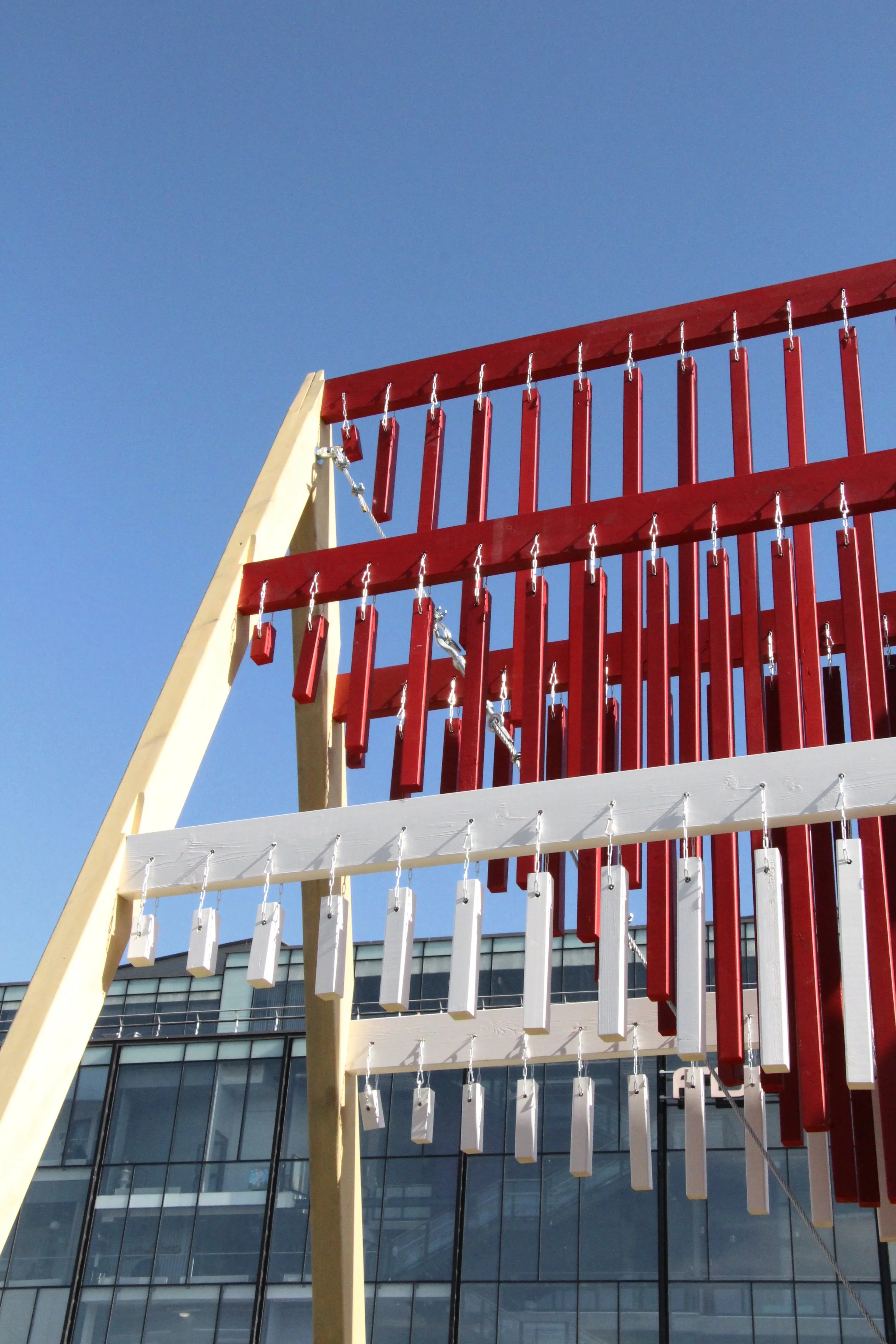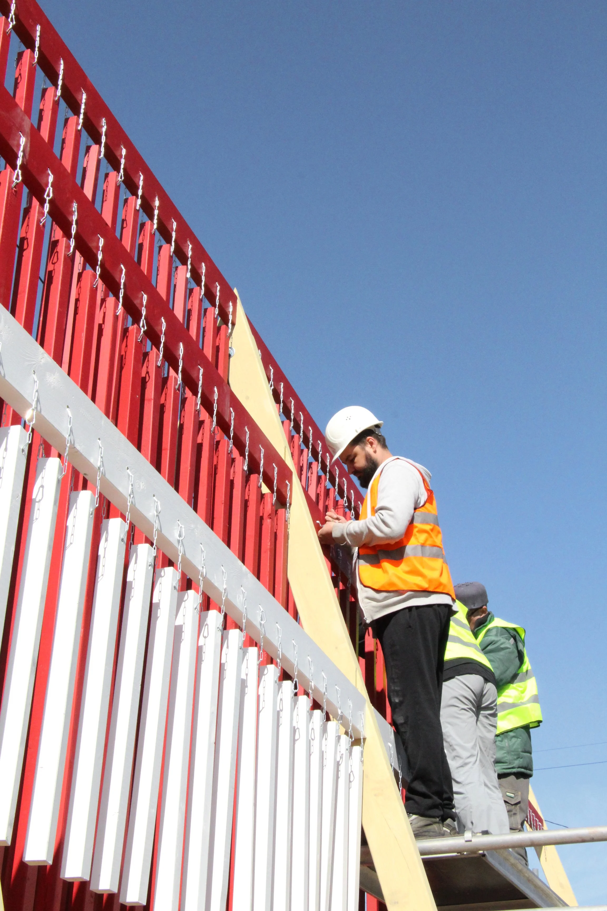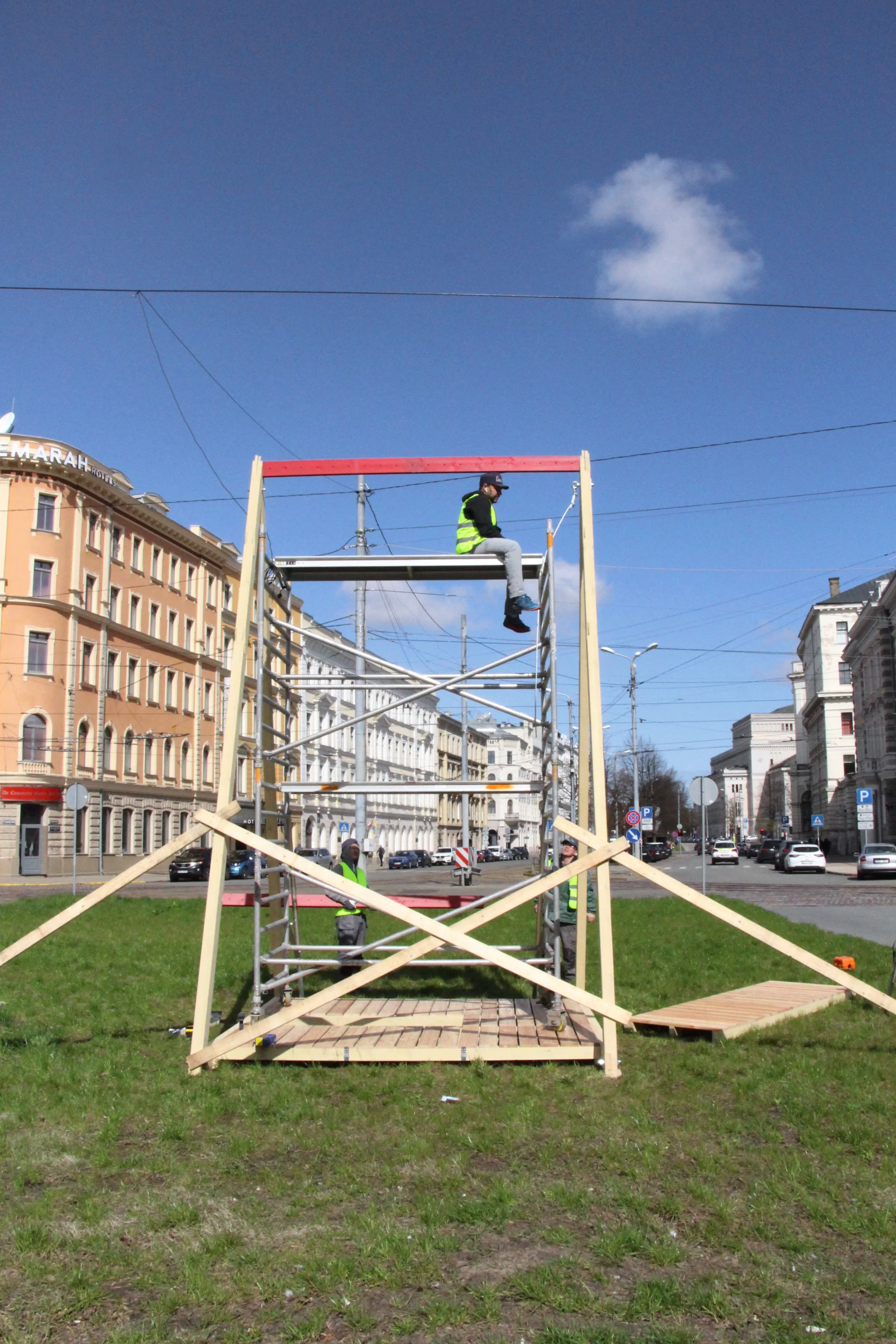 We aimed to revive a part of this feeling in the urban environment. In such a loud and hurried part of the city, where cars, buses, the rumble of trams alternate with running people, to place an object that is calmly present. An installation which invites every bypasser to approach the flag and hear the tension rippling in the air, where the clatter of wooden lats alternates with the noise of the city. Take a few steps through this flag and become part of it, remembering that we each form part of the State and carry its freedom.