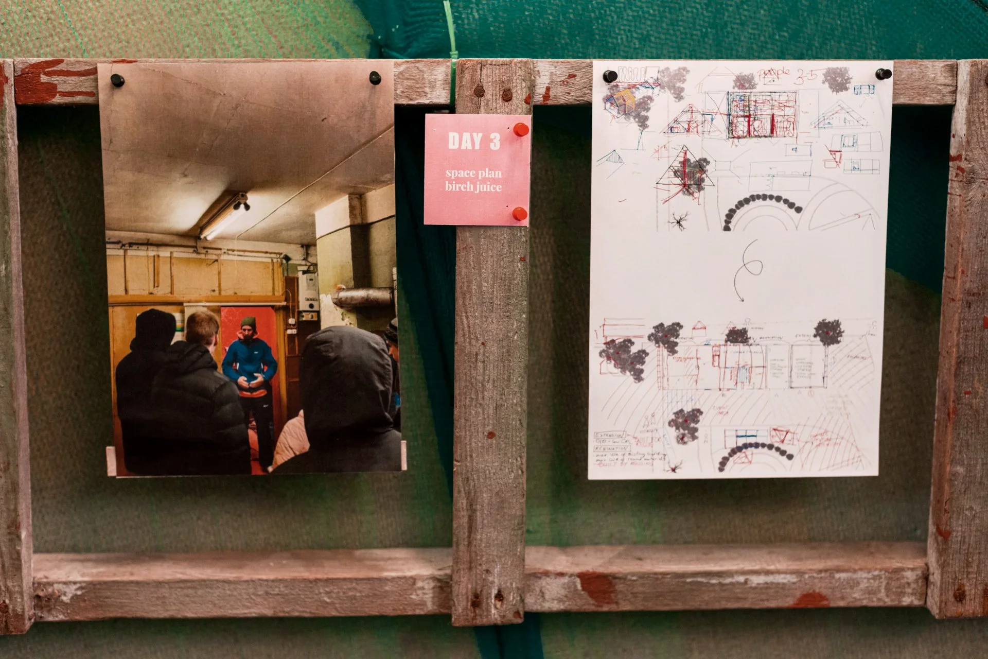 The exhibition was held in half of the existing building. Two full rolls of scaffolding nets were attached to walls and ceilings of two rooms to protect from dust and debris as well as to function as attachment points for the LED-light strings and exhibition drawings. The podests for the models were built from material found in the building.