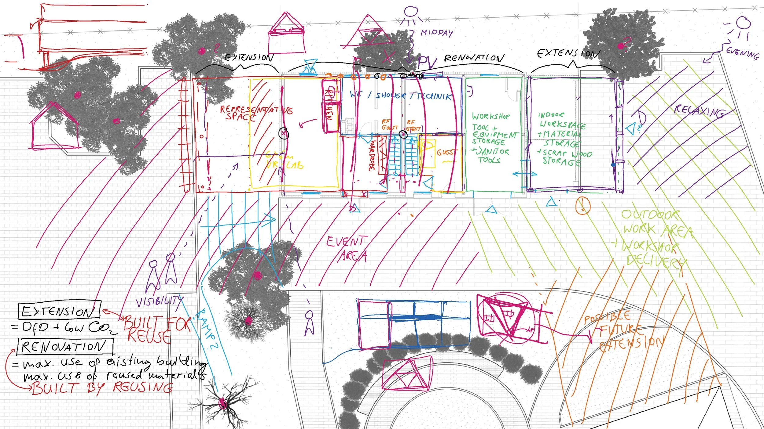 The second week was all about hands-on experience on site in Valmiera, where students worked with point cloud 3D models, created a detailed material audit for the building and identified potential circular material and waste flows. This information, together with input from the potential future users of the building was used to develop a vision for the extension and renovation of the building into a Sustainable Construction Hub (launchpad for the Open Innovation Hub for Smart and Sustainable Cities and Villages) for the New Building School at Vidzemes Augstskola. The existing building is preserved as much as possible and renovated with mostly reused and recycled materials. The extensions are timber constructions which showcase the design for disassembly strategies and circular construction materials.