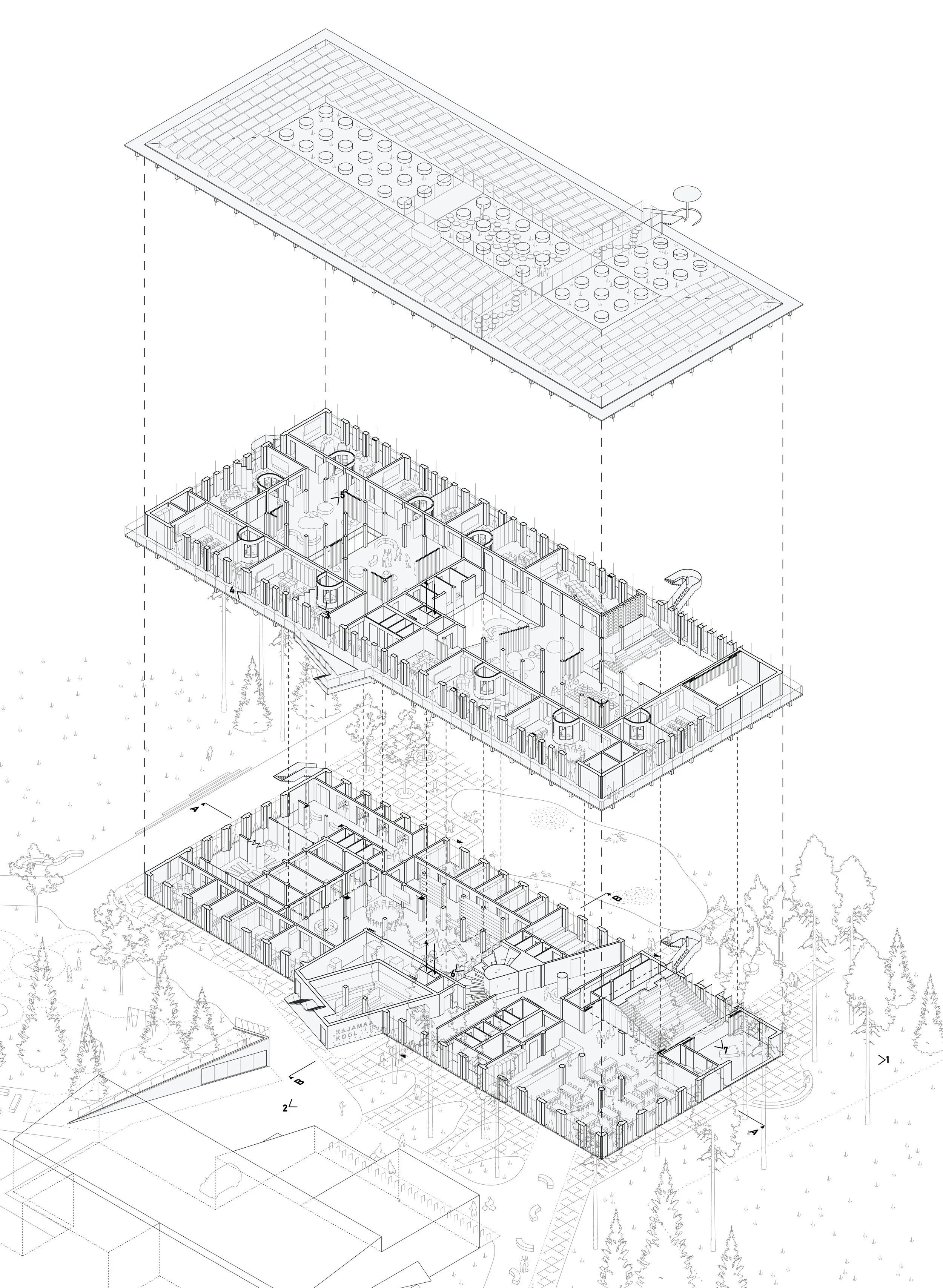 All timber elements are designed for disassembly, allowing for future reconfiguration or reuse.