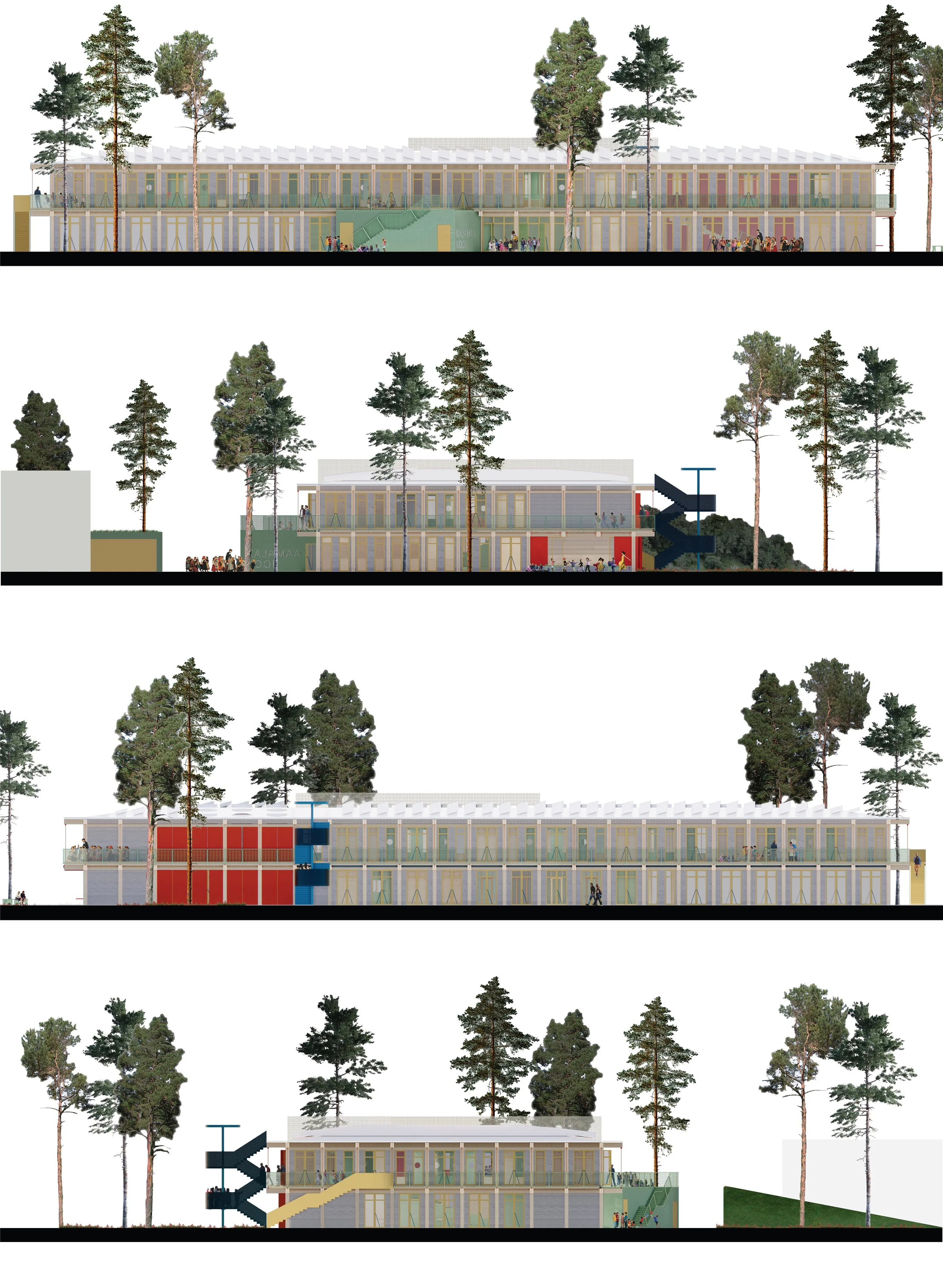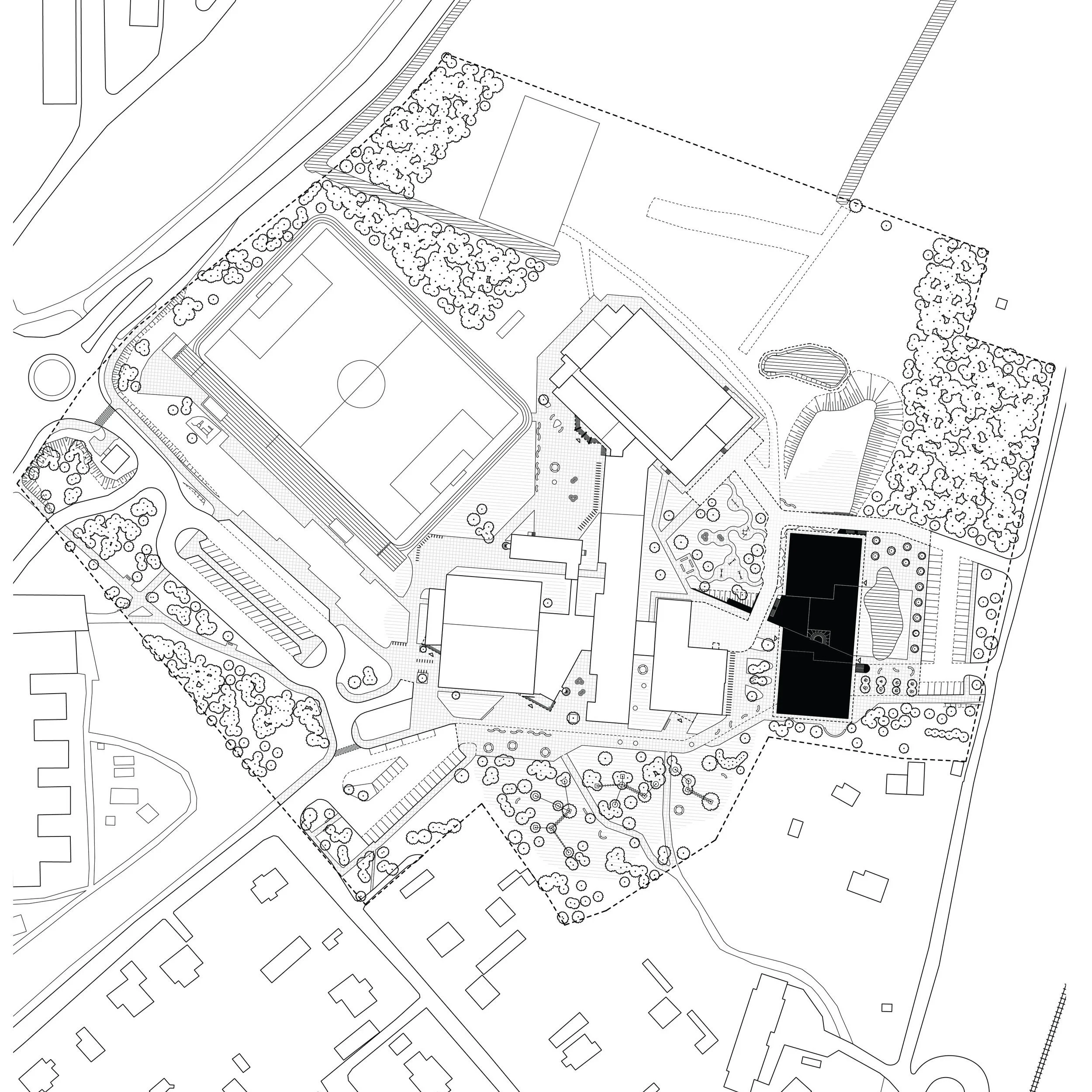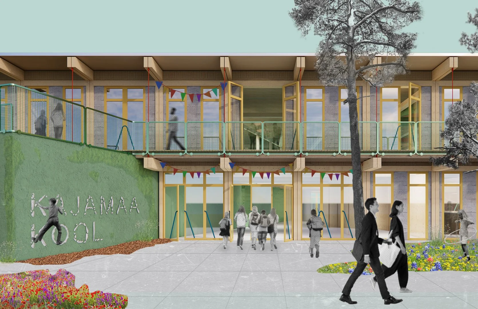 The new addition to the Kajamaa School campus reflects both student growth and the school's evolving identity over time. Since the original building was completed in 1977, the campus has expanded in a rhythmic sequence of building volumes separated by green courtyards. The new wing continues this pattern of growth, while also improving the site’s overall layout by replacing the car-dominated area in front of the school with a pedestrian-friendly promenade. This new pathway connects the existing school, the new extension, the music school, and the sports hall, creating a clear and safe route for children and visitors across the entire campus.