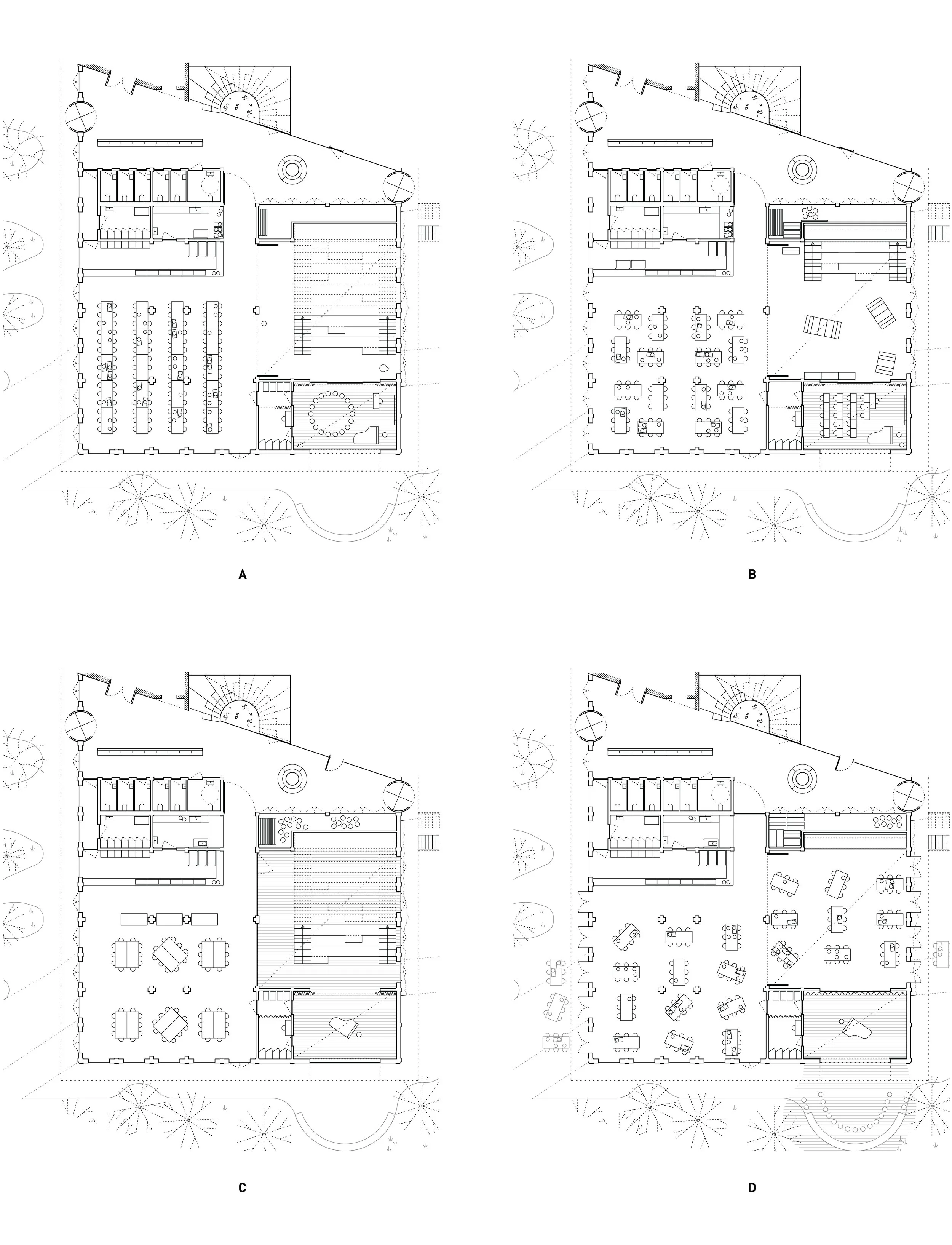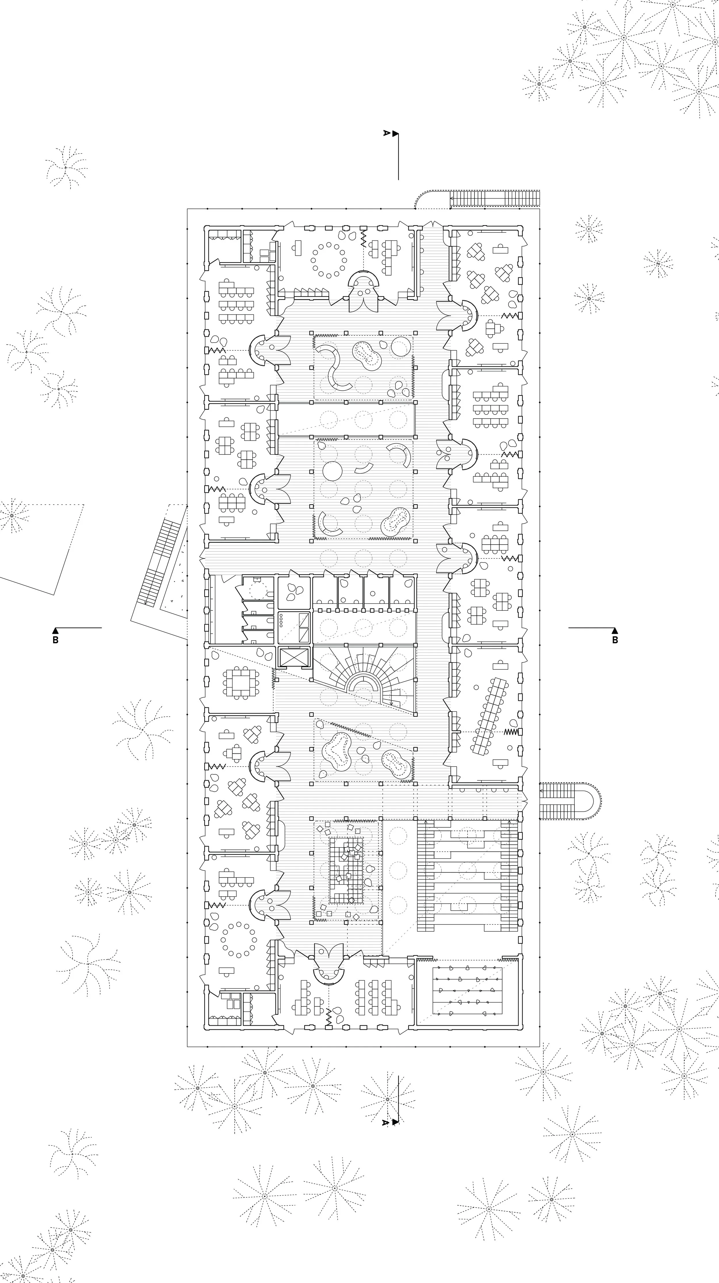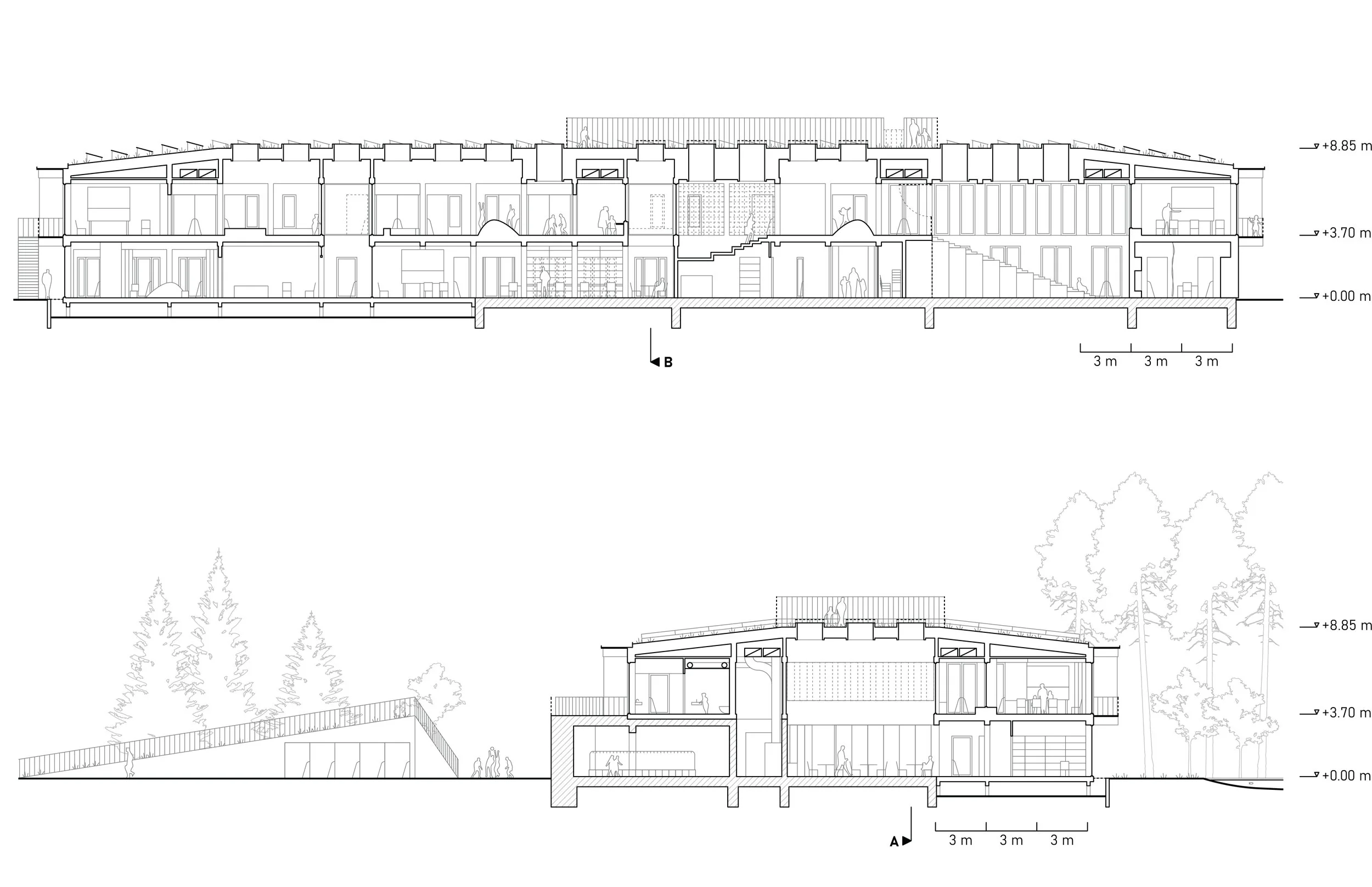 The upper floor contains the main learning spaces. Classrooms are organized into three clusters, each with a shared breakout area filled with natural light. Each cluster also has its own exterior stair, allowing direct access to the garden. The classrooms are designed for flexible use: movable partitions and adjacent smaller rooms make it easy to adapt the space for individual work, group activities, or different teaching formats.