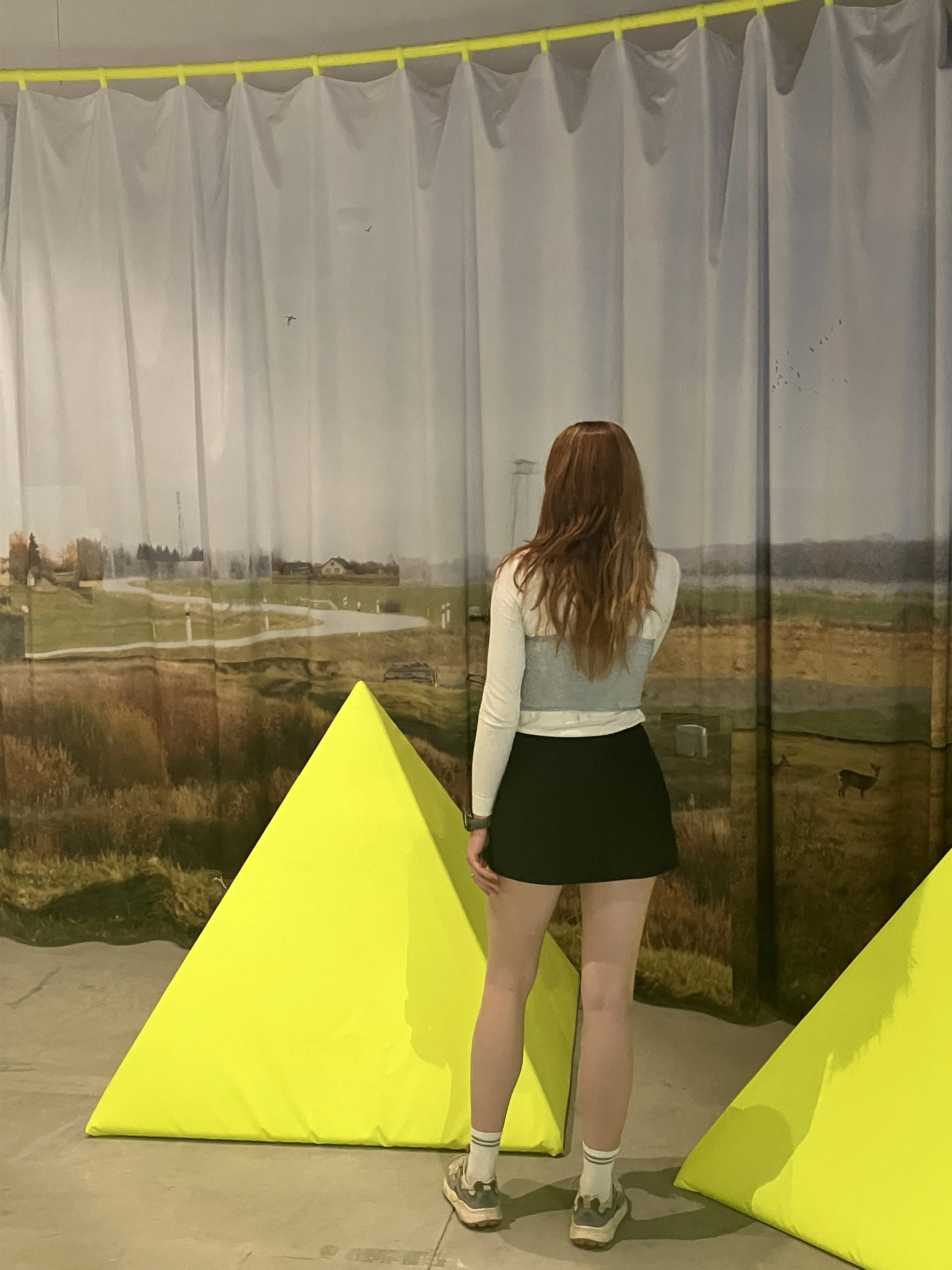 80 square meters of printed curtain display our photo collage, created from images taken during our trips through Latvia and the border region. The curtain hangs in an oval shape, with one side open toward the Info Curtain.